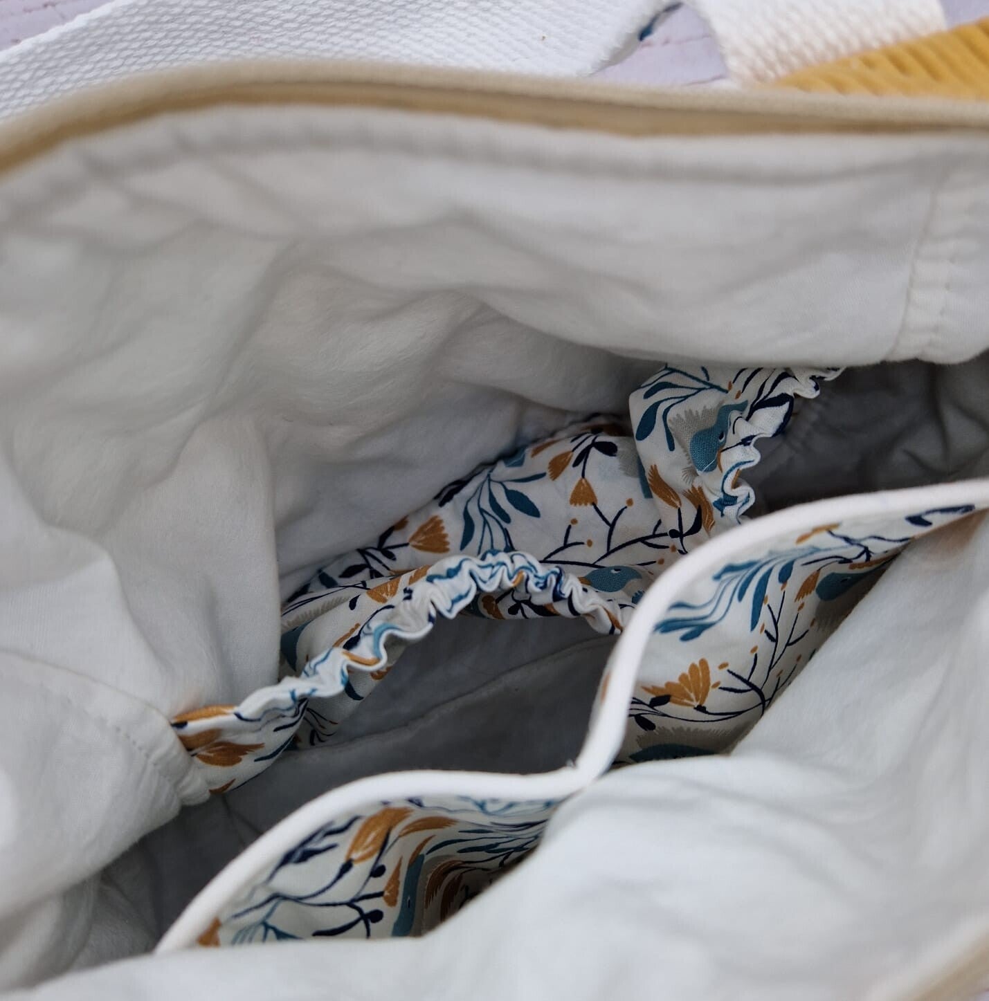 Le coton fleuri et le velours côtelé apportent une touche de féminité et de douceur, tandis que le tissu effet daim en bas ajoute une note de sophistication et de modernité.